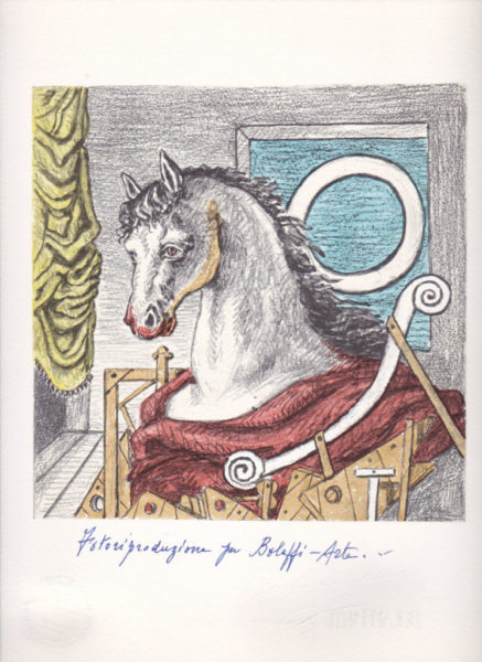 • Cachet d’atelier ‘Giorgio De Chirico’ in basso a destra. Sul retro insieme al numero c’è l’impronta del sigillo notarile.