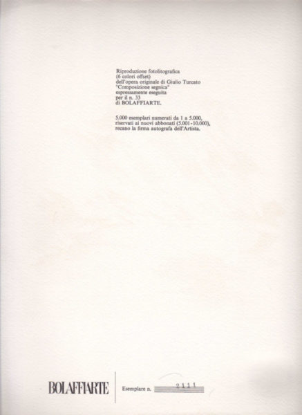 • Firmato ‘Turcato’ in basso a destra. Numerato sul retro
